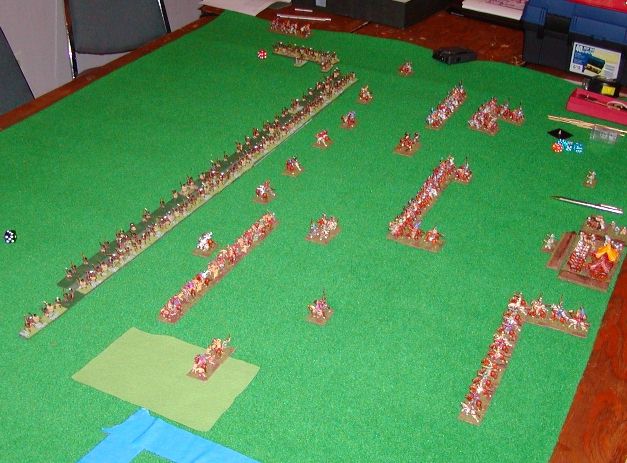 The Khitan manouvre for advantage in round 1 against a Post Mongol Samurai. I totally miss-guessed my opponent's deployment. My blade fast quickly tore through his CinC's ax(X) breaking the army for a 10:0 |